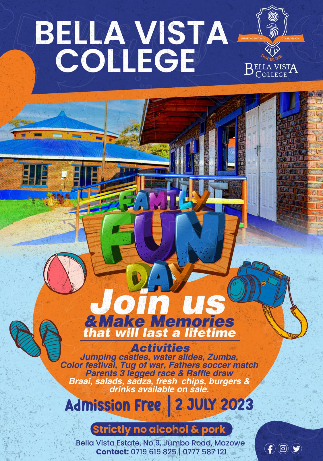 Bella Vista College Bella Vista Estate, 9 Jumbo Rd, MazoweJoin us & make memories that will last a lifetime. Activities include : Jumping castle water slide, zumba color festival tug of war father soccer match parents 3 legged race raffle draw. Braai, salads, sadza, fresh chips, burgers & drinks available on sale